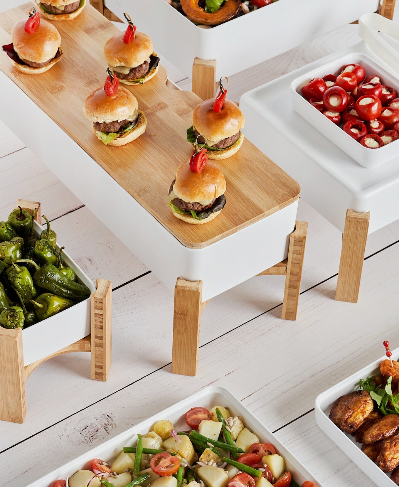 Realza tus presentaciones culinarias con este elegante alzador. Su diseño estrecho y alargado es ideal para resaltar bandejas de canapés, mini sándwiches o postres individuales. La madera natural aporta calidez y sofisticación a cualquier mesa de buffet.