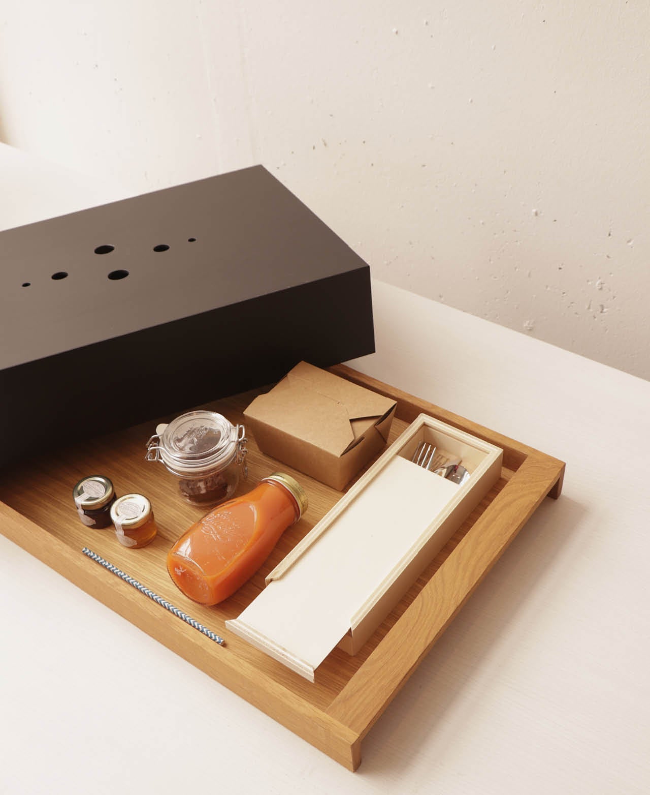 La colección incluye distintos tamaños para varias funciones —bandeja de bienvenida, de room service y de amenities— y se presenta en dos versiones: roble macizo con acabado en aceite alimentario y fresno contrachapado con laca mate negra. Una línea cálida y elegante, inspirada en el arte y cuidada hasta el detalle.